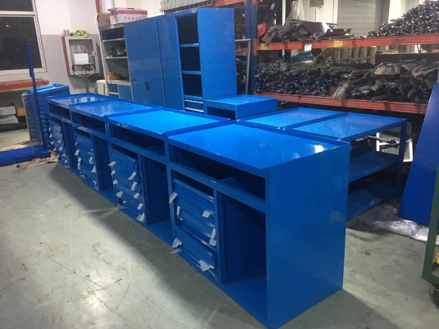 工具車適用于工具、刀具、零部件在生產(chǎn)現(xiàn)場中的定置管理,使您的物品存取工作真正做到準(zhǔn)時(shí)、準(zhǔn)確、高效、低耗。 結(jié)構(gòu)特點(diǎn) 編輯 1、 高強(qiáng)度的結(jié)構(gòu)設(shè)計(jì)和噴粉表面處理工藝,能適應(yīng)工廠較復(fù)雜的工作環(huán)境。 2、 裝有優(yōu)質(zhì)軸承和導(dǎo)軌,保證抽屜承受額定載荷時(shí)亦能輕松順暢開合。 3、 根據(jù)需要可自由選擇配置不同高度的抽屜,充分滿足生產(chǎn)現(xiàn)場的需要。 4、 可以配置帶有防油膠墊的頂框,保護(hù)放置物品不受損害以及防止物品滑落。 5、 鎖具先進(jìn),只用一把鎖就能鎖上所有的抽屜,保證物品安全。 6、 柜體底部配有墊腳,保護(hù)柜體在放置或移動(dòng)時(shí)不受損壞,方便用叉車搬運(yùn)。 多種表面顏色,滿足生產(chǎn)現(xiàn)場整體布置的需求 7. 全寬型鋁合金抽屜把手及可更換的標(biāo)簽,美觀、方便、實(shí)用。 8. 先進(jìn)的抽屜安全扣設(shè)計(jì),保證抽屜在關(guān)閉后不會(huì)意外滑出。 9. 更有4種國際標(biāo)準(zhǔn)色以供選擇(ral5005,ral5015,ral6011,ral7035),滿足生產(chǎn)現(xiàn)場整體布置的需要。 10. 采用國際先進(jìn)水平鎖具,只一把鎖就能鎖上所有抽屜,保證物品安全。 11. 加底框及高品質(zhì)的腳輪,推行平穩(wěn),方向性好,剎車固定后不會(huì)滑動(dòng)。 12. 先進(jìn)的互鎖裝置,在打開一個(gè)抽屜時(shí)其他抽屜自動(dòng)鎖死不能打開,防止抽屜全部打開造成柜體傾斜。 13.工具車的工作臺(tái)面采用獨(dú)特的注塑成型,強(qiáng)度更高。 14.中央鎖采用環(huán)形鎖匙結(jié)構(gòu),可延長鎖的使用壽命。 15.工具車四角都配有新型復(fù)合材料制成的防撞條,能有效的緩沖意外碰撞造成的損害。 16.工具車的重型車輪,125MM直徑更容易跨越障礙物。 17.臺(tái)面有特殊的小凹槽,可用來盛放黃油等液體,方便使用。 18.工具車抽屜內(nèi)可以存放豐富的工具模塊。 19.抽屜兩側(cè)采用疊加式滾珠滑軌,具有優(yōu)秀的順暢度。 20.工具車的每個(gè)抽屜擁有自鎖功能。 21.工具車兩側(cè)采用網(wǎng)孔板內(nèi)加鋼板的雙層鋼板設(shè)計(jì),使車體更加堅(jiān)固,持久耐用。 工具車與工具柜的區(qū)別 工具車是可以移動(dòng)的工具柜,適合在生產(chǎn)現(xiàn)場安全、合理地運(yùn)送工具和配件。 工具車由各種型號(hào)的工具柜增加頂柜和腳輪等移動(dòng)部件組成。 工具車的外型尺寸的高度:重型工具車為所選用的工具柜的高度加上140mm;輕型工具車為所造工具柜高度加上80mm。高強(qiáng)度的結(jié)構(gòu)設(shè)計(jì)和陰極電泳底漆表面處理工藝,能適應(yīng)工廠較復(fù)雜的工作環(huán)境。